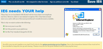 Fuente y Articulo completo: http://spamloco.net/2009/04/basta-de...ntra-ie-6.html Con mucho humor e ironía han lanzado una campaña para salvar al navegador Internet Explorer 6, se trata de una broma del 1ro de Abril que dado su éxito se mantendrá online durante algún tiempo.